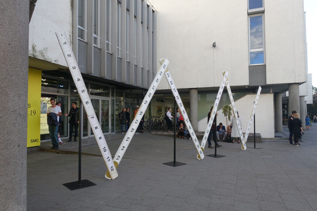 It has become a moveable item, folded it can be sent via plane and re-erected in short time, since its genial structural elements or arms to hold it upright. It can be placed in front of every building to question its metaphorical size within the city structure.