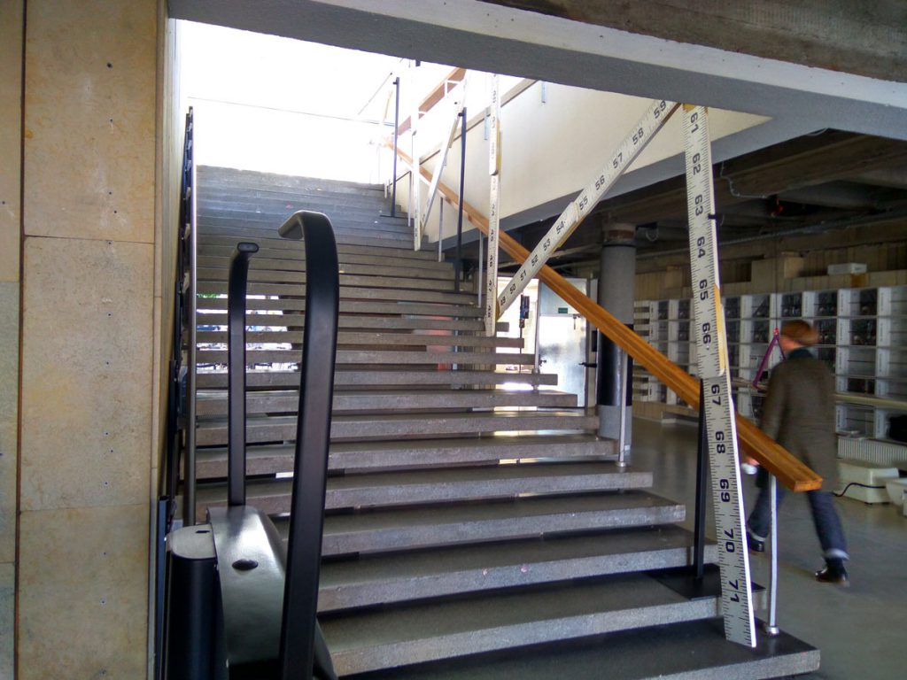 Conceived for the parking space of the Goethe Institute in Mexico City the project consists of a wooden sculpture, a magnification of a U.S. standard wooden ruler (inches). The piece acts like a scale for the environment, used to measure spatial dimensions it here measures in its own rights, diminuishing actual space into plan or project size. It also acts as an arch, since you can pass under it, and it adds a festive element by looking like a crown with two light bulbs on the upper spikes.