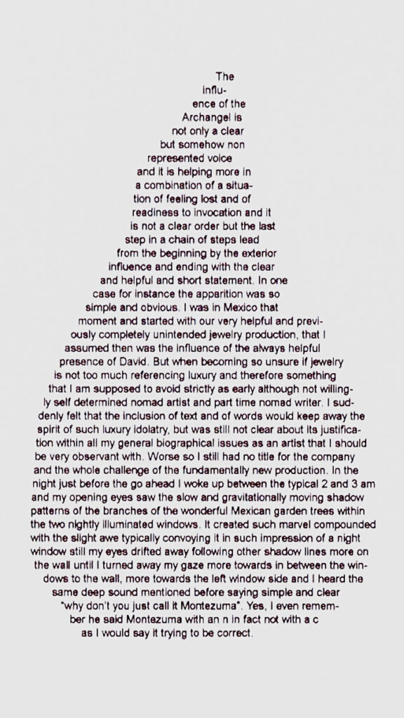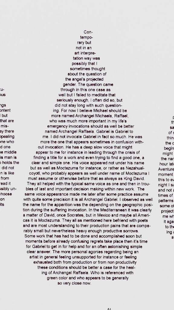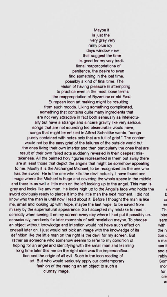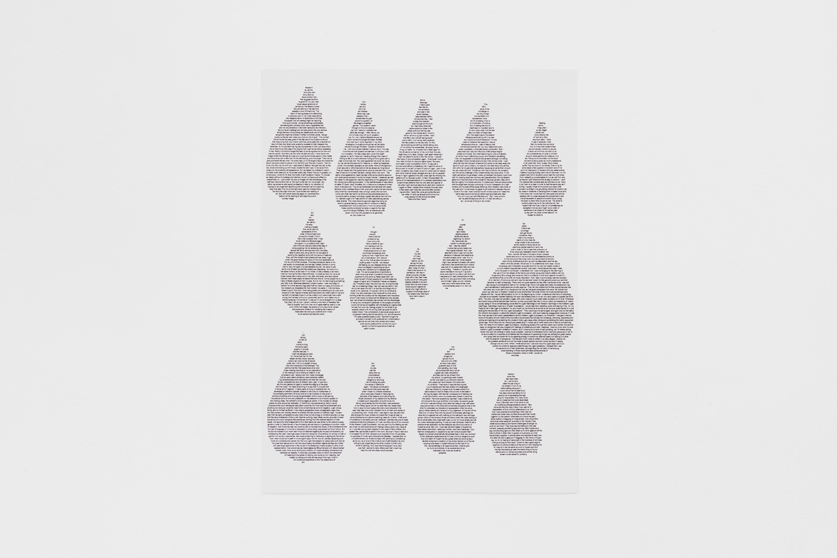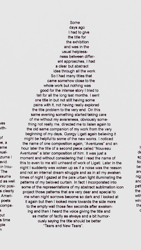 Dieser Imitatio gegenüber steht bei Josef Strau die mimetische Geste an sich, die Sprache, also die Möglichkeit Erlebtes und Gefühle nicht nur weiterzugeben, sondern im Schreiben oder Erzählen sich überhaupt erst zu entwickeln. In dem in der Ausstellung gezeigten Textbild passiert dies doppelt, indem die Sprache in ihr Bild, die Traurigkeit / die Träne, wieder hineingefaltet ist, so wie sie sich als Text aus dem Geschehen selbst herausfaltet. Hier entsteht nicht nur das Portrait, sondern die Person, das Leben an sich, durch das Schreiben.