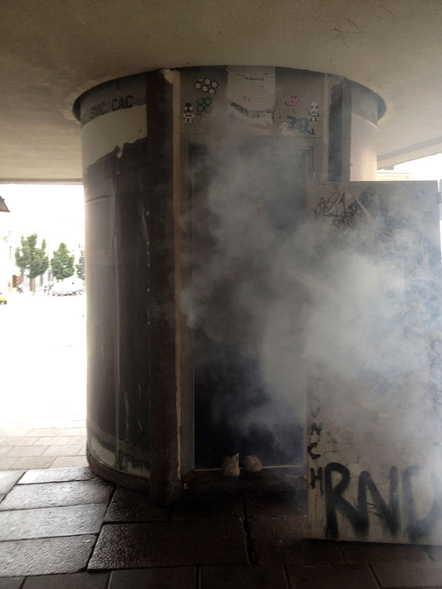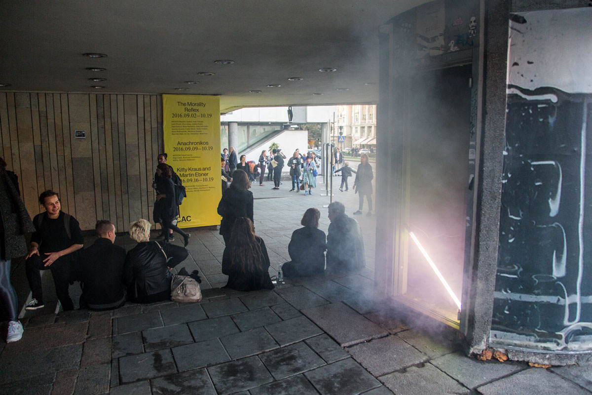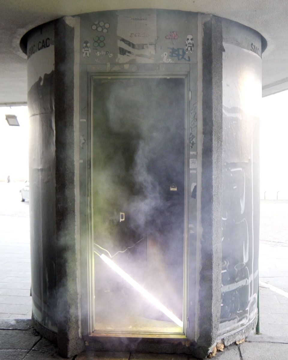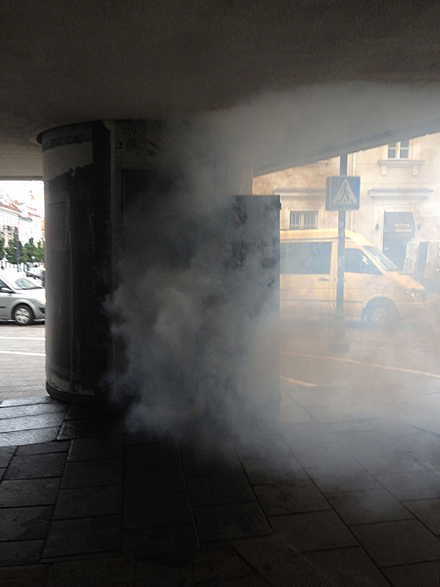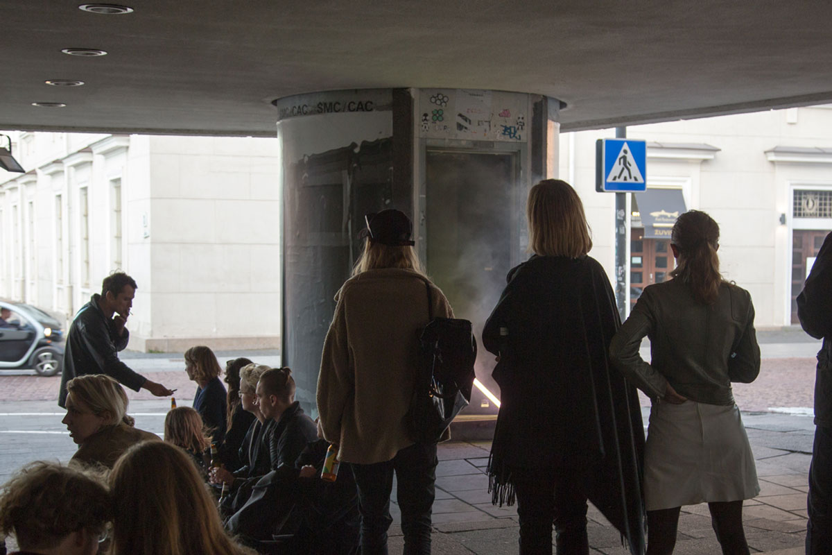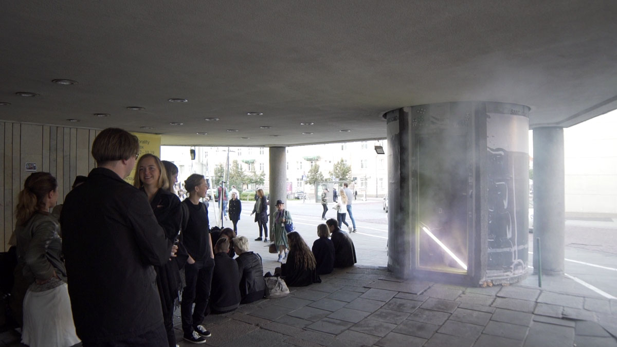 This whole column was filled with artficial ice, thus emitting smoke and playing music, collected from play lists of visitors, museum co-workers and the artists.