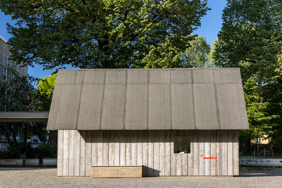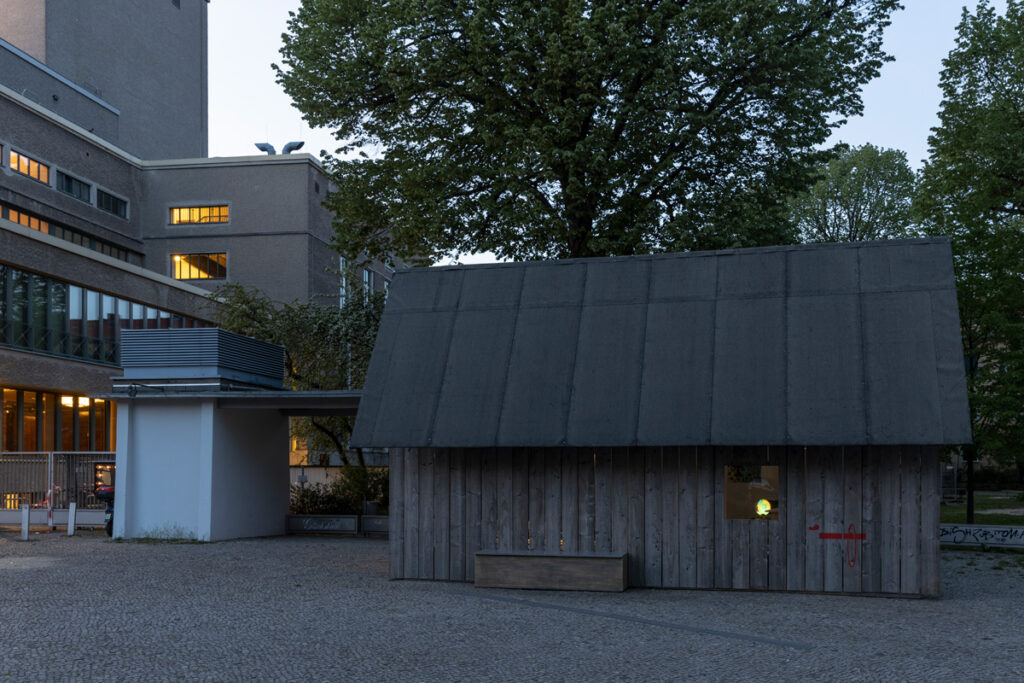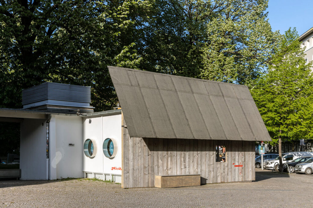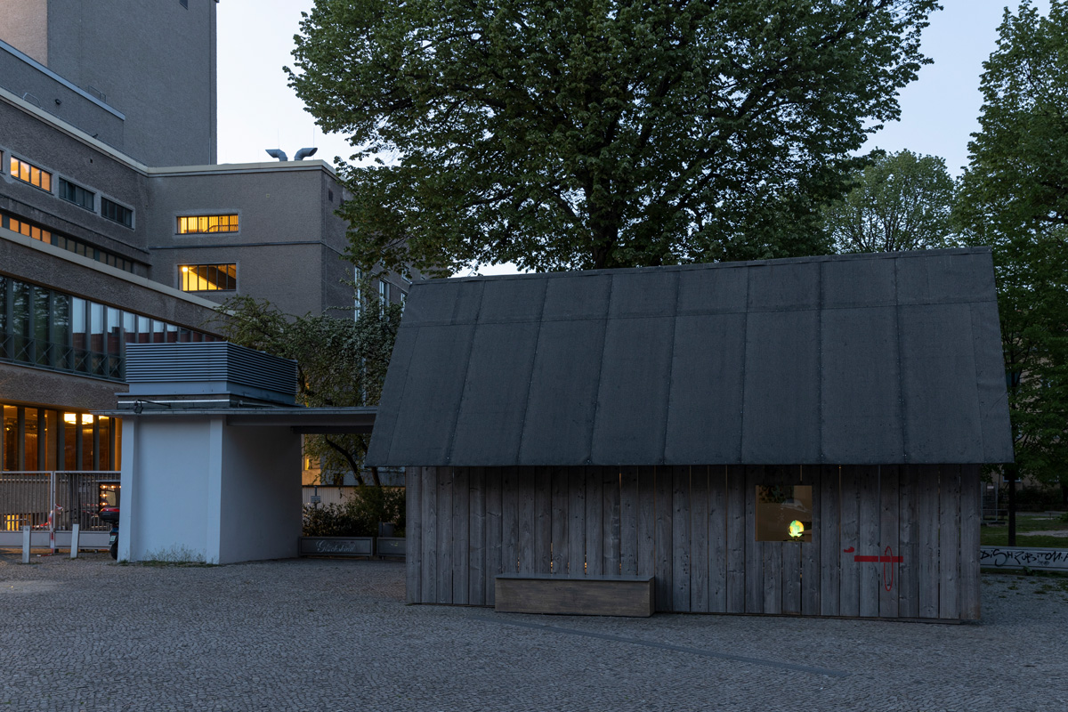 As part of an invitation to the magazine Starship, Ariane Mueller and Martin Ebner conceived the re-design of the Volksbühne pavillon, an urban one level 50ies structure formerly used as the ticket office of Volksbühne and later used as a gallery space, as a barn, which should also be usable as a space craft. The conception discussed that this barn came from the former barn-district (Scheunenviertel) where the Volksbühne is situated. After a time travel of app. 20 years, which also marked the time in which the Berlin based magazine Starship existed at that time, it had landed again at its former site, Berlin Mitte.