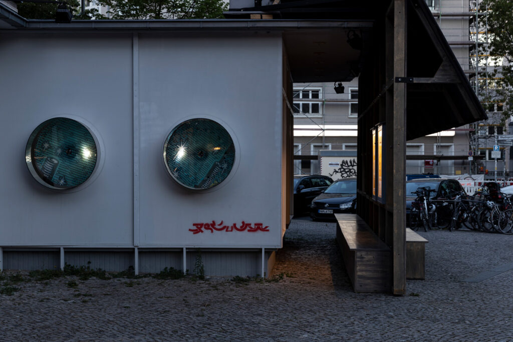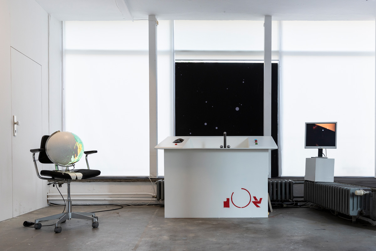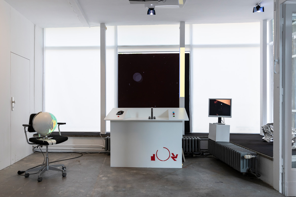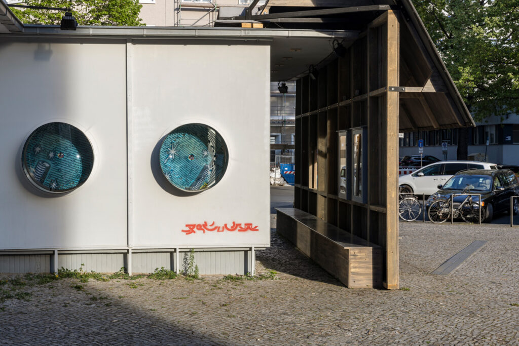 While the barn stood on the square like a rural alien to the urban surrounding, inside there was an exhibition as a sort of storage space for the art of the 1990ies as well as the technical necessities, a pilotes desk, a screen depicting the galaxies it had crossed, and turbines, which fit the artwork of artist Nina Rhode, as well as an overall signature and logo-type designed by Till Sperrle.