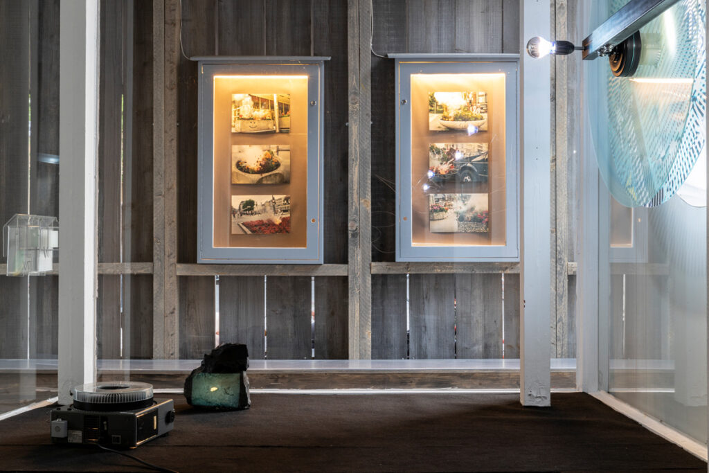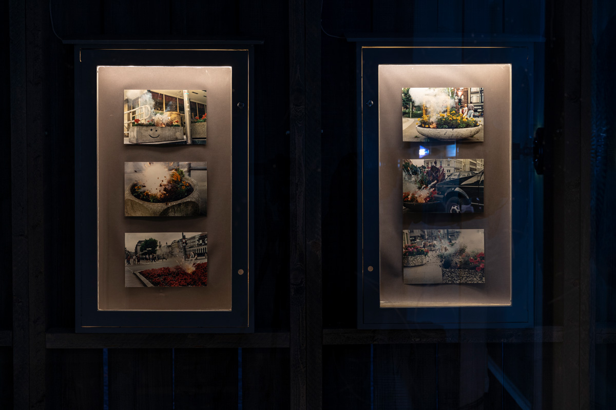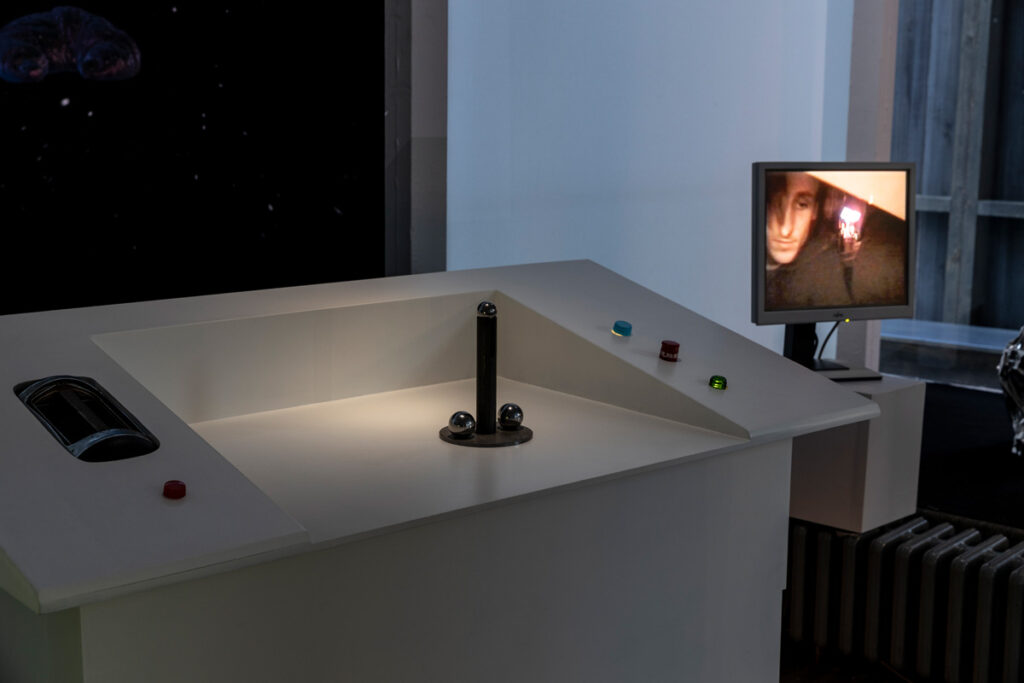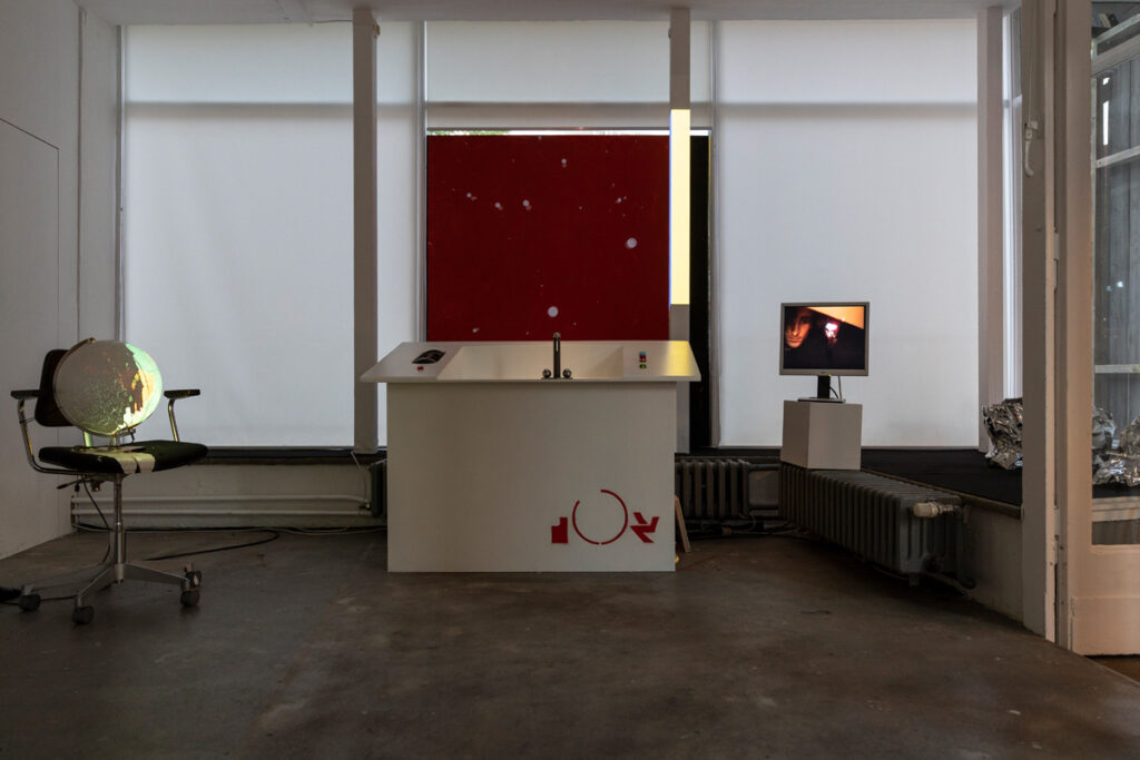 While the barn stood on the square like a rural alien to the urban surrounding, inside there was an exhibition as a sort of storage space for the art of the 1990ies as well as the technical necessities, a pilotes desk, a screen depicting the galaxies it had crossed, and turbines, which fit the artwork of artist Nina Rhode, as well as an overall signature and logo-type designed by Till Sperrle.