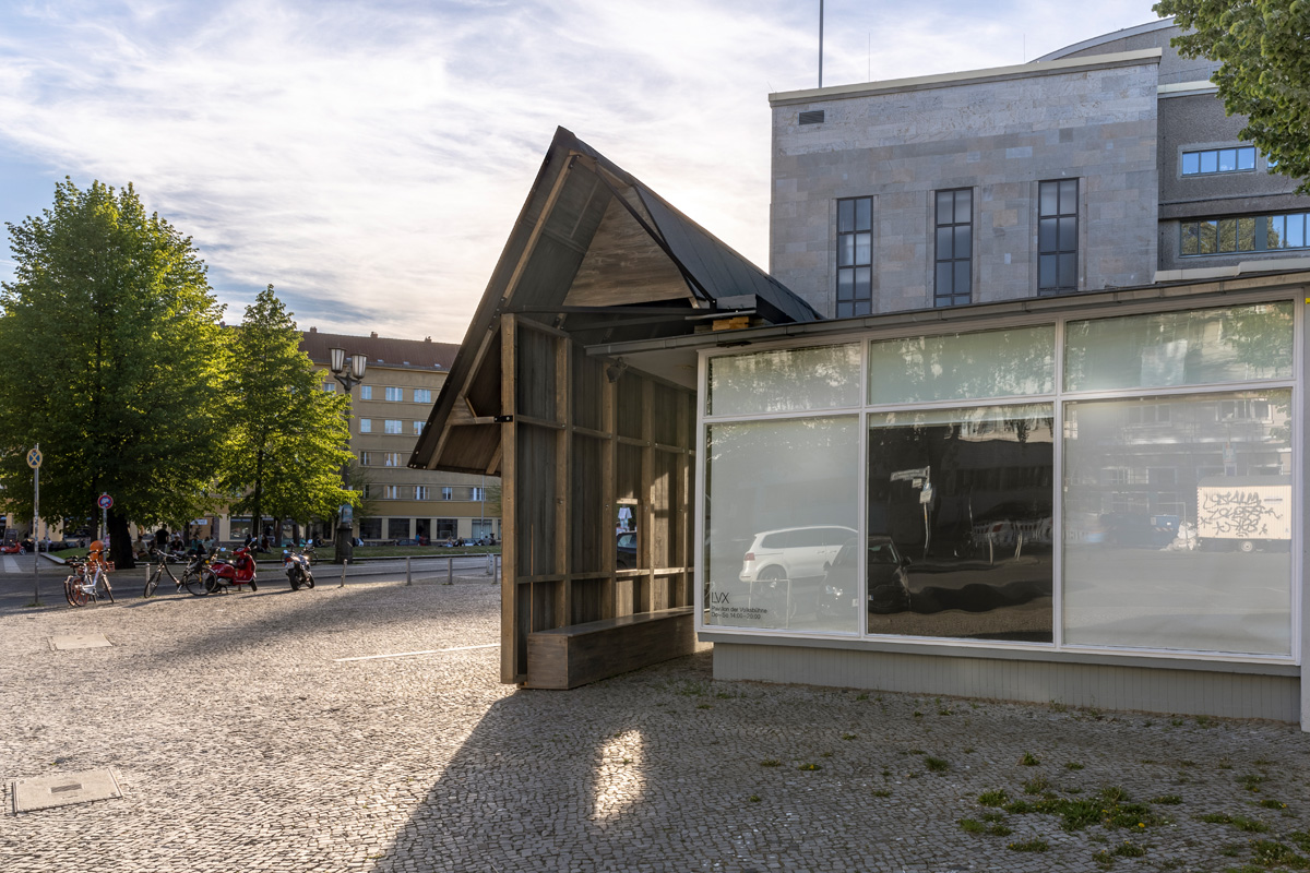 A wooden front covering the facade of the Volksbühne pavillon, forming a corridor with benches, a pilotes console, a screen, and turbines on the outside of the pavillon.