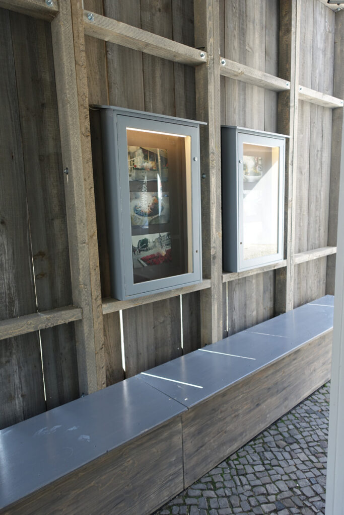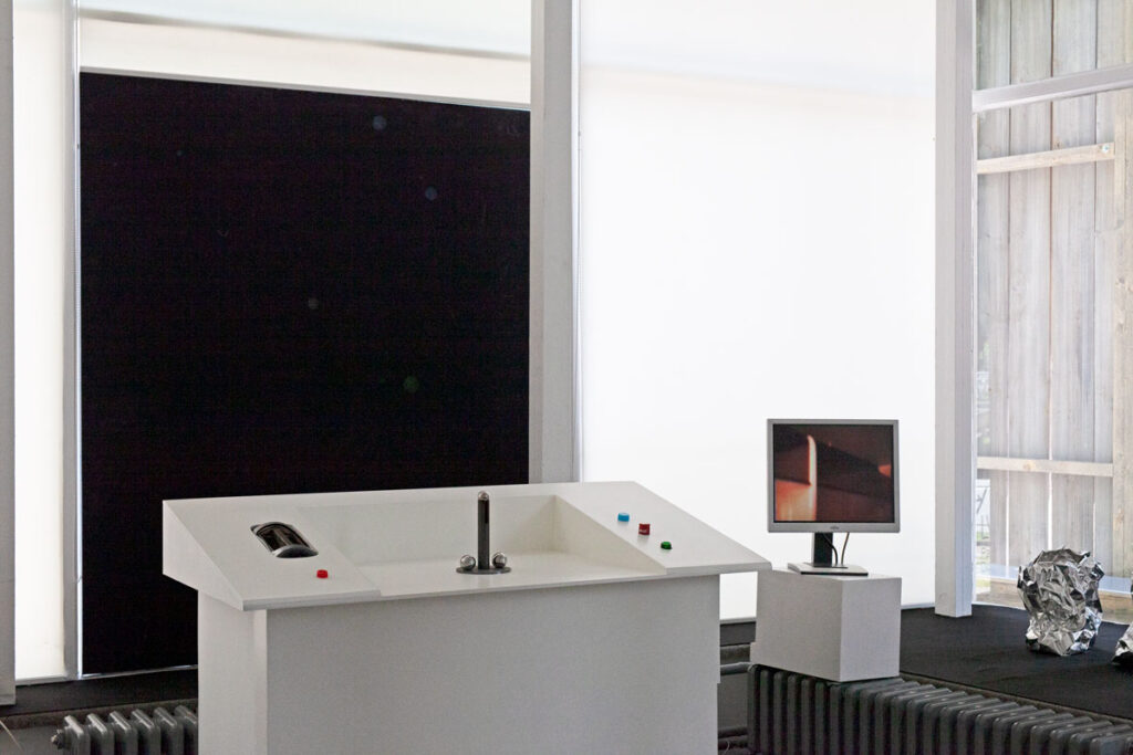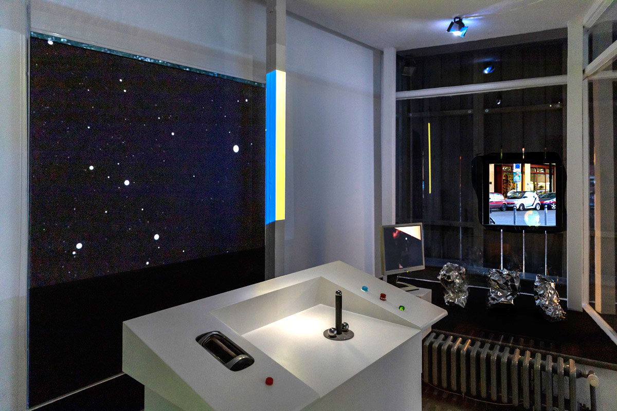 While the barn stood on the square like a rural alien to the urban surrounding, inside there was an exhibition as a sort of storage space for the art of the 1990ies as well as the technical necessities, a pilotes desk, a screen depicting the galaxies it had crossed, and turbines, which fit the artwork of artist Nina Rhode, as well as an overall signature and logo-type designed by Till Sperrle.