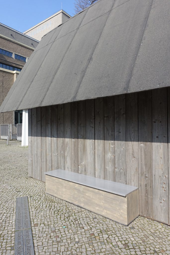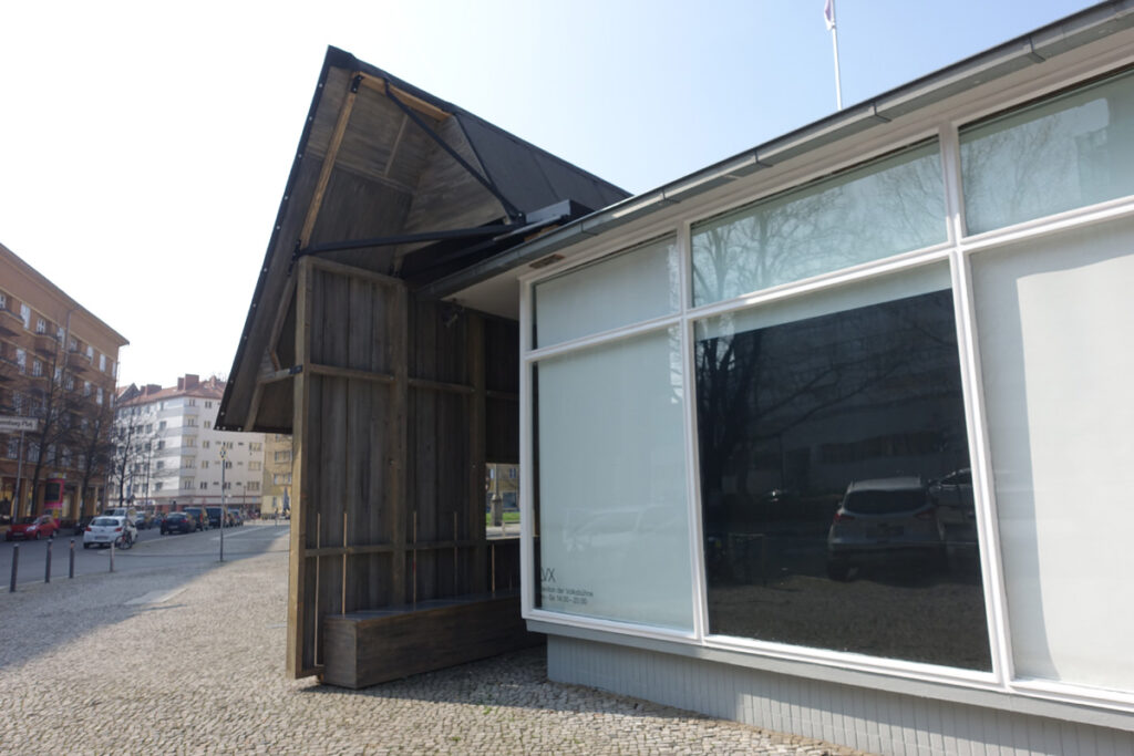 A wooden front covering the facade of the Volksbühne pavillon, forming a corridor with benches, a pilotes console, a screen, and turbines on the outside of the pavillon.