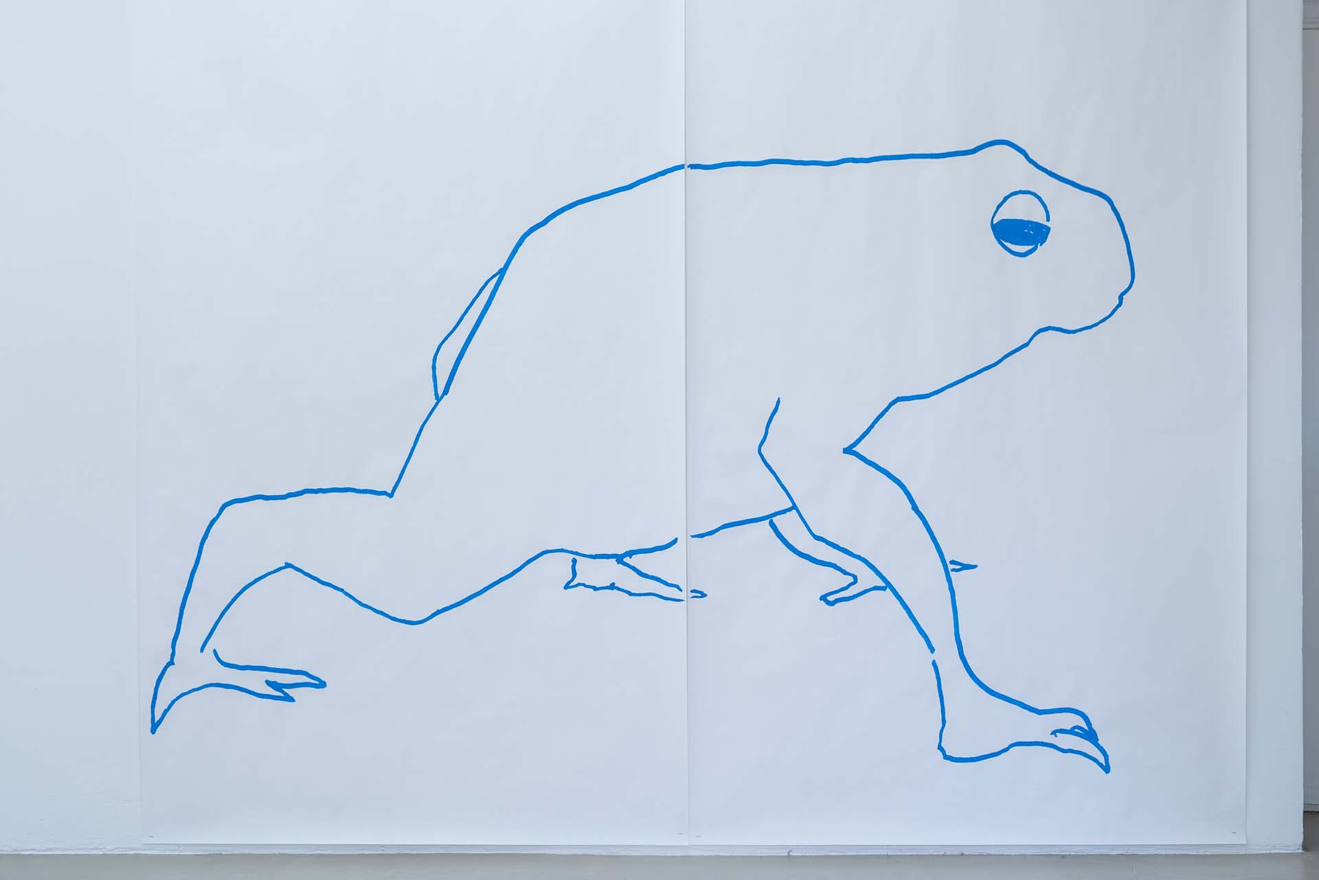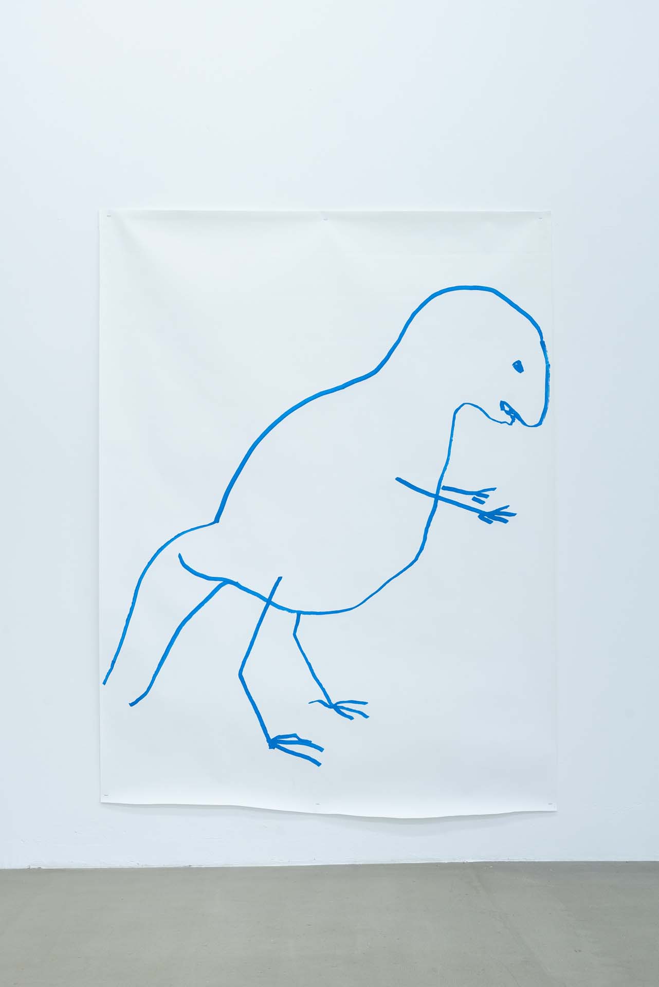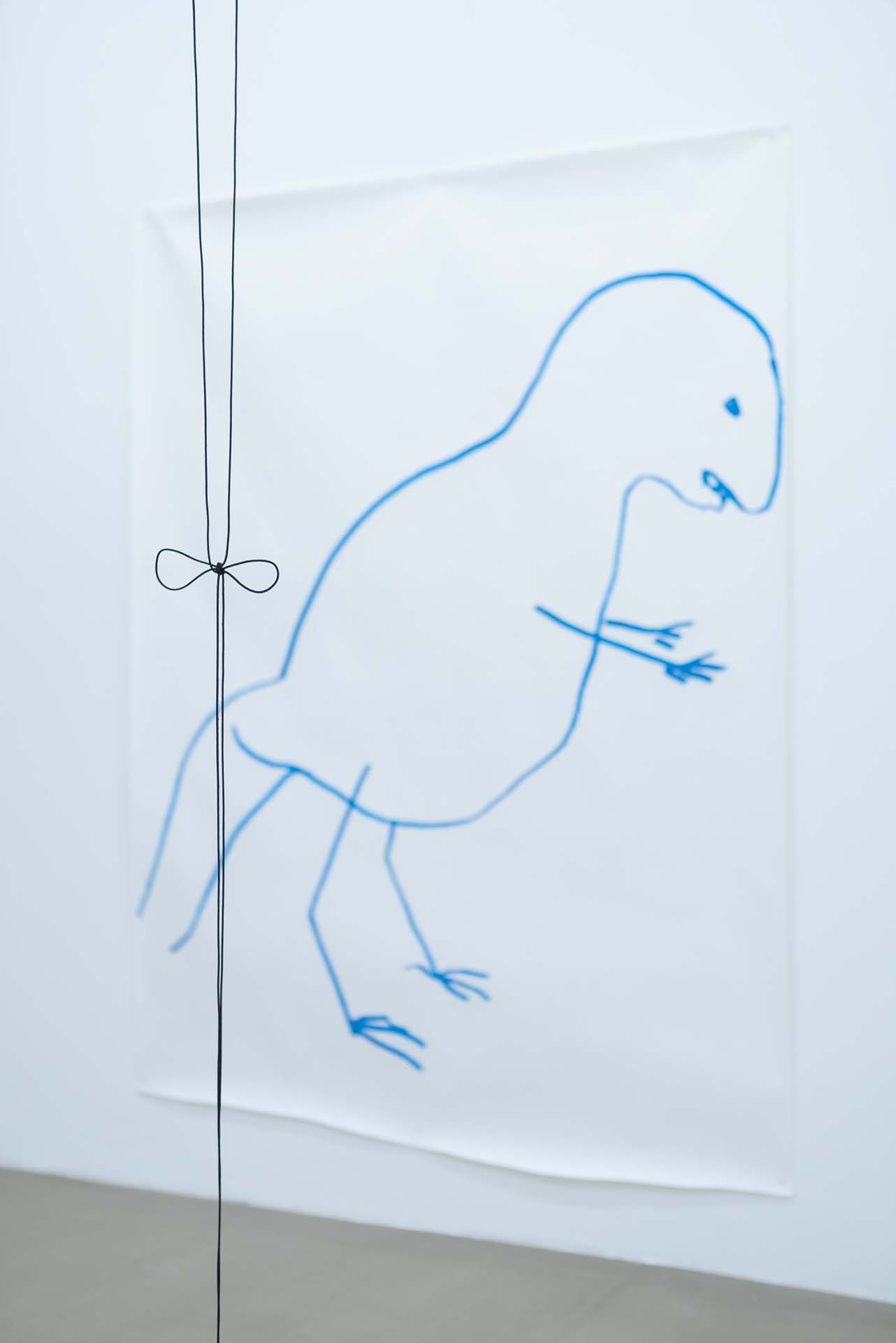 As much as we are Kate, however, we are also Fred. Fred Sandback was looming at the margins of this text all along. Much the same way it now looms within this exhibition, as a specter, as an absence-felt. Much the same way how his sculptures, lines traversing empty spaces, allow our vision, our imagination to draw out objects that are not, in fact, present. They are absent, and this is why we can see them, see them so vividly that we can no longer un-see them. Andrea Fraser was right to cry at the sight of them, as it truly is a tragic sight, one that speaks about another failure to restore a ruined world through the wholeness of form. We, a community based on change, a community based on a loss of communion, we are tied to the tail of the snaky. We will not let go of the illusion of a possible communion as we need something to dream about. And so, to transform into an ox is not yet suicide, as a suicide would mean that dreams would cease. They would cease in the forms that we would still be able to recognize, they would cease in terms of the objects we dream about. The ox would not dream of its former life as a man.